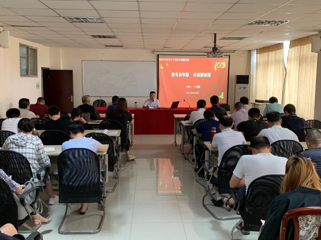 本网讯 刘芳 摄影报道 6月23日下午,BB贝博艾弗森官方网站党委召开党史学习教育专题党课报告会暨中心组第七次集中学习会,党委书记庄瑞刚同志以《奋斗百年史 开启新征程》为题,为BB贝博艾弗森官方网站全体党员教师在1308 会议室作专题党课。学校宣传部理论教育科副科长刘志飞同志和张若石同志莅临指导。
